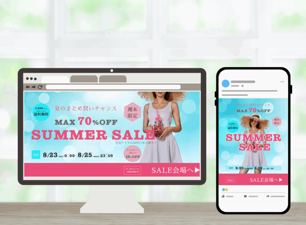 バナー 【ECサイトバナー】 投稿日: 2025年8月21日 投稿者: tantemamie SUMMERセール バナーモックアップ 【バナー ファッションECサイト 夏のセール】架空案件 制作概要 ターゲット:25〜35歳女性 商材:プチプラ系ファッション 目的:週末限定セールの告知(MAX70%OFF+クーポン) 掲載想定:ECサイトTOPバナー(PC/SP) 制作ポイント 情報整理(割引・期間・特典・CTAを明確に) 配色(夏らしい爽やかさ+ピンクでセール感を演出) レイアウト(PC横長・SP縦長で視線誘導を最適化)
